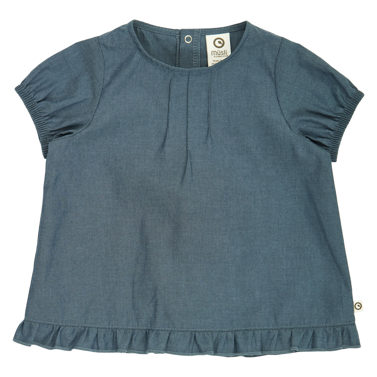 Cute and light top with short puff sleeves in woven chambray cotton.