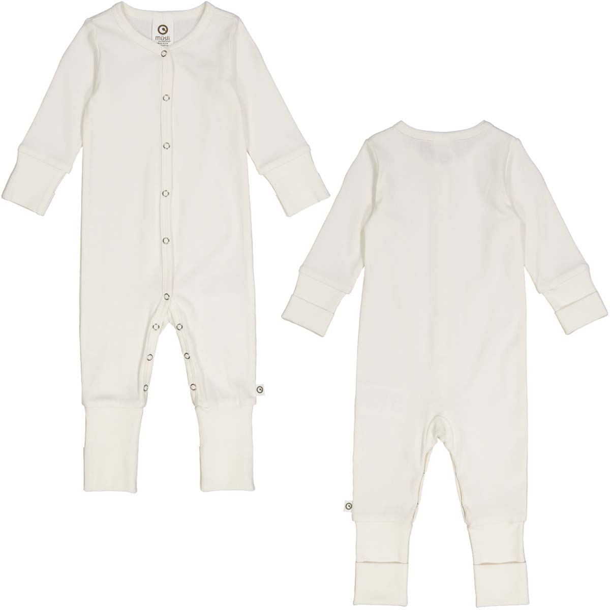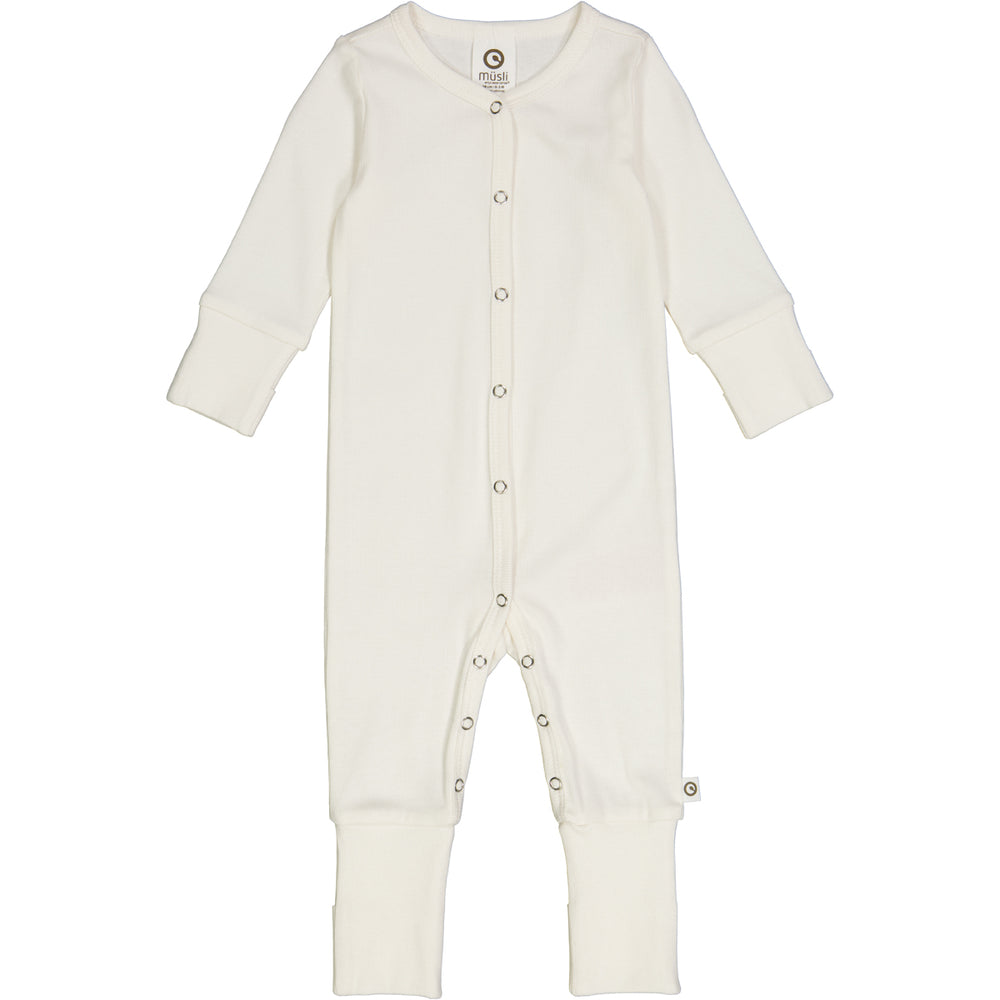 The bodysuit closes at the front with press buttons and has reversible feet and hands.