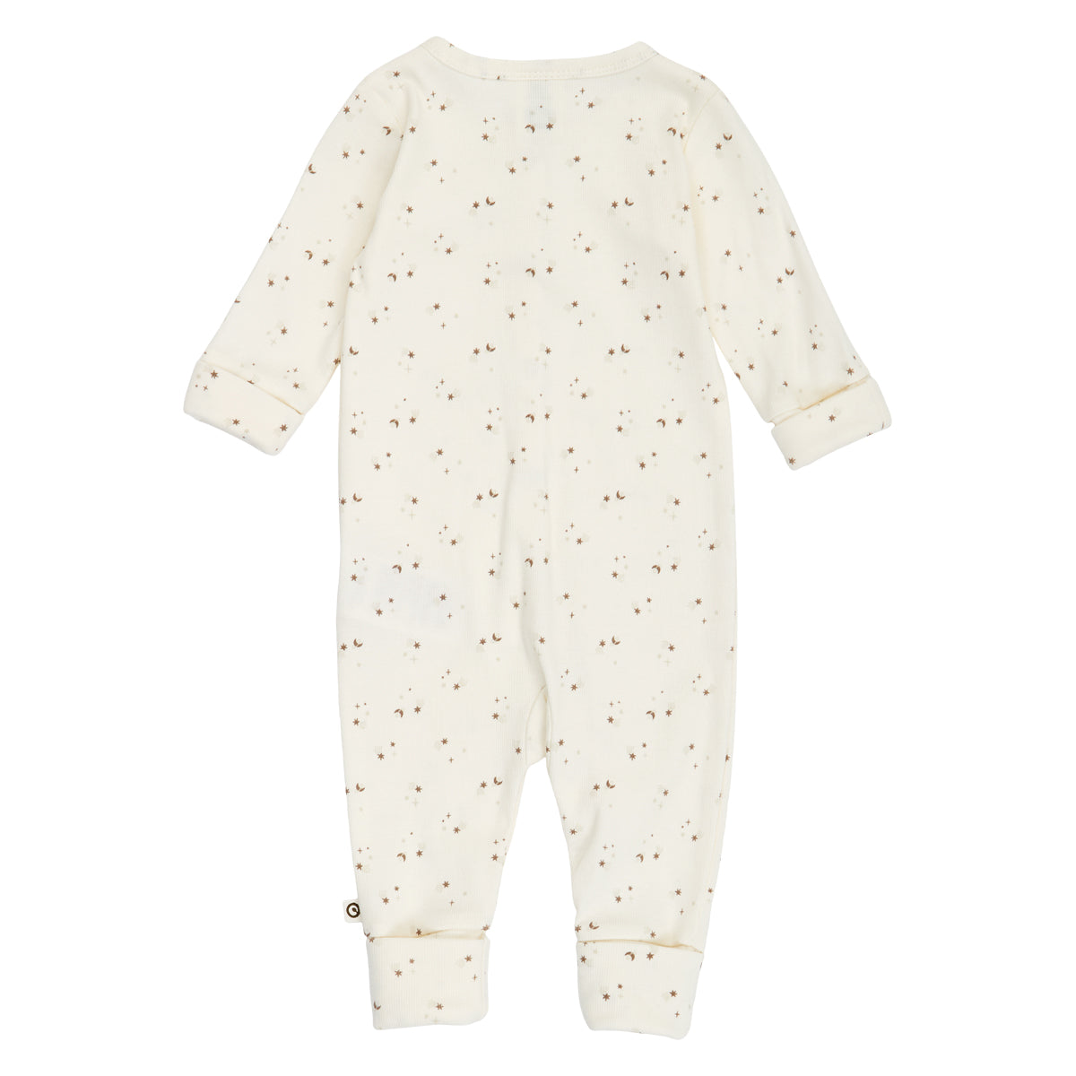 The bodysuit closes at the front with press buttons and has reversible feet and hands.