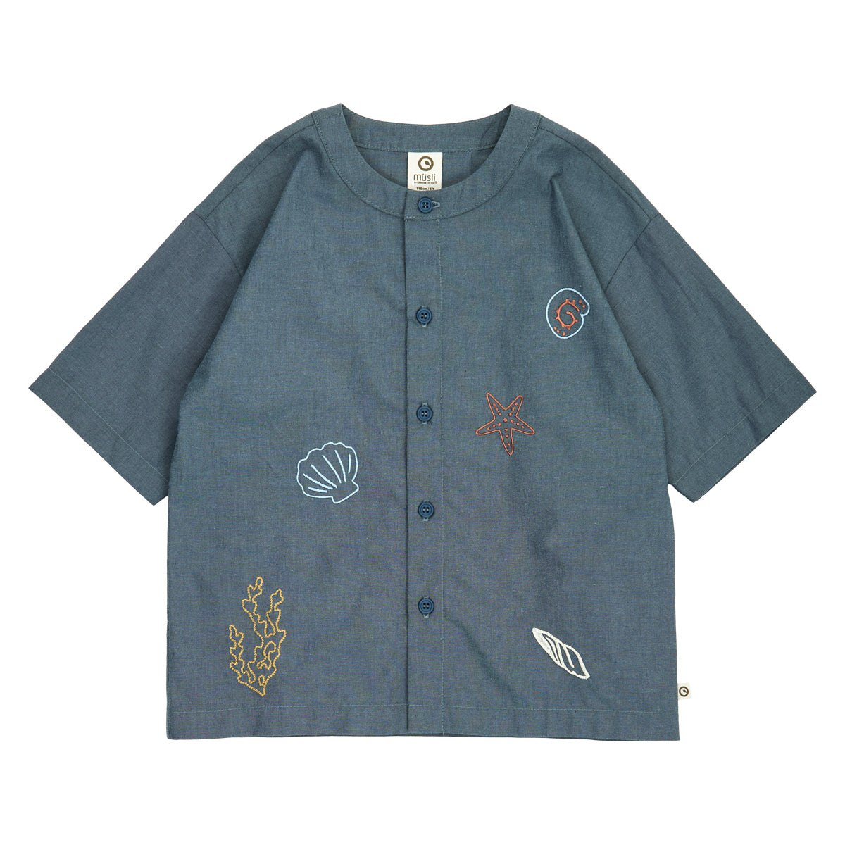 The shirt is designed with a low China collar and there is embroidery of the elements of the sea on the shirt.