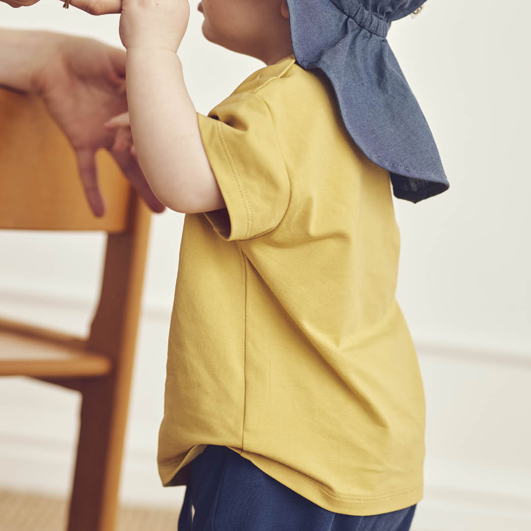 The T-shirt is classically designed and has press studs in the neck opening.