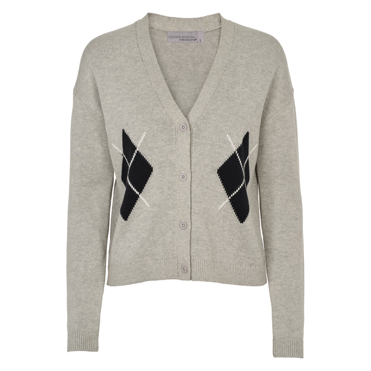 Beautiful knitted cardigan with buttons and large beautiful harlequin pattern on the front.