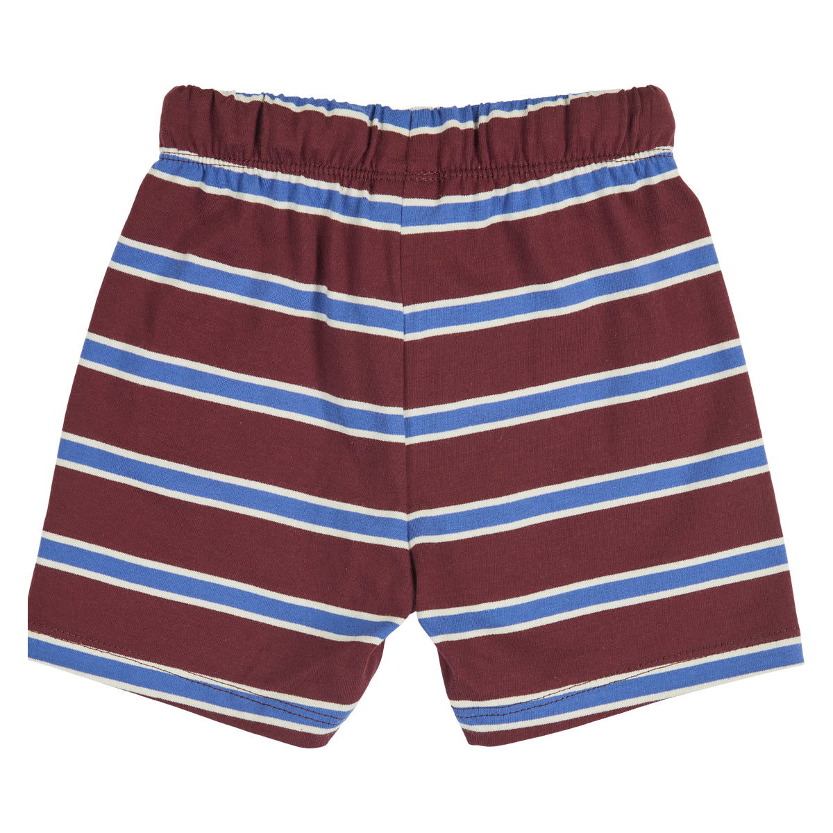 The shorts have smart wide transverse stripes in blue, dark red and cream colors.