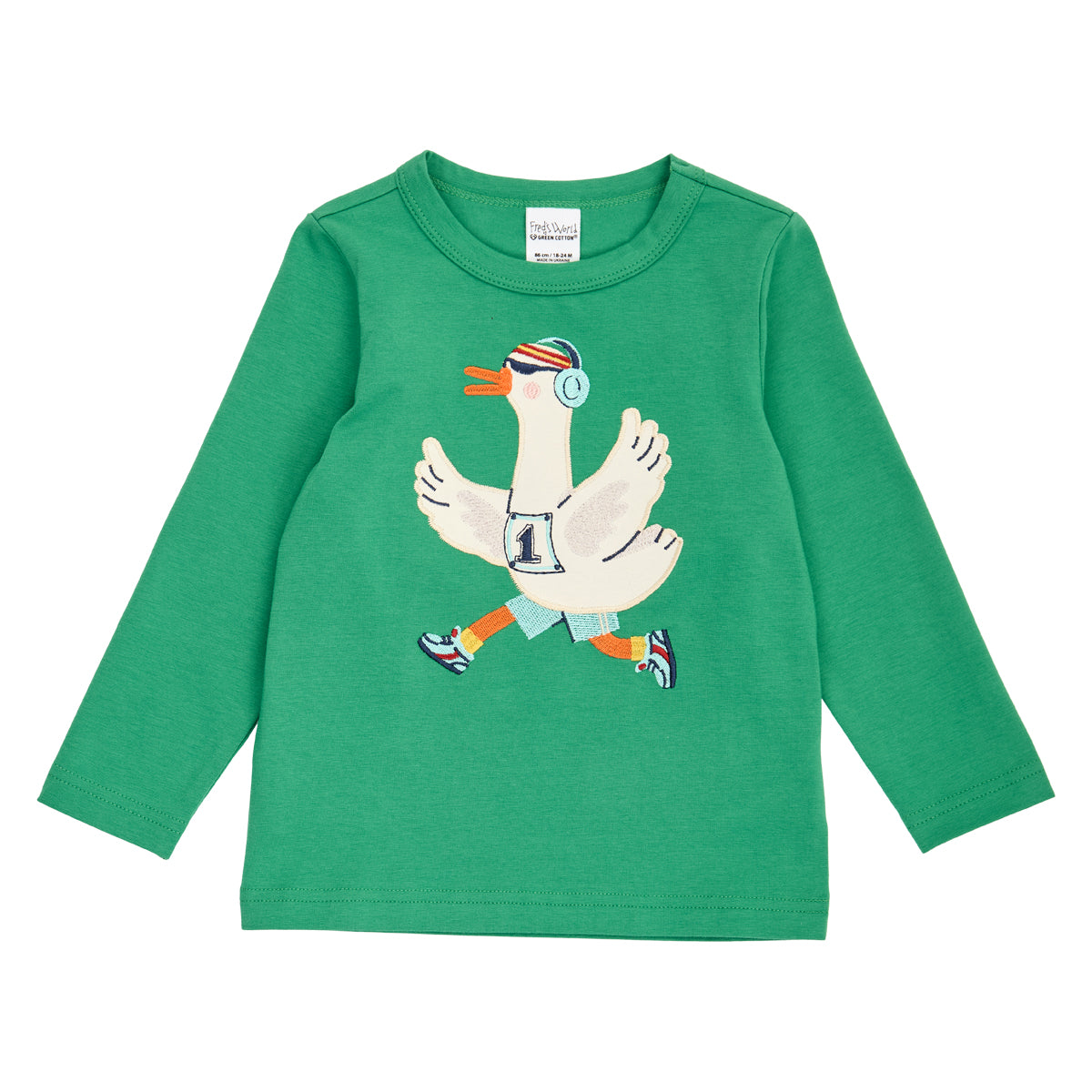 Nice and funny top with long sleeves and with a nice appliqué on the front of a goose that is jogging.