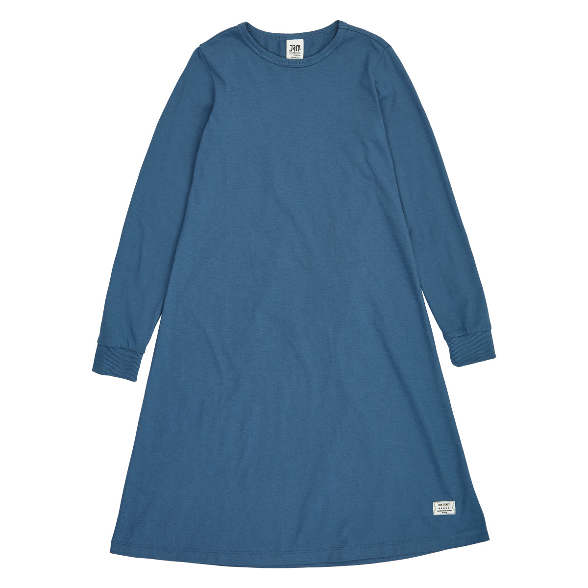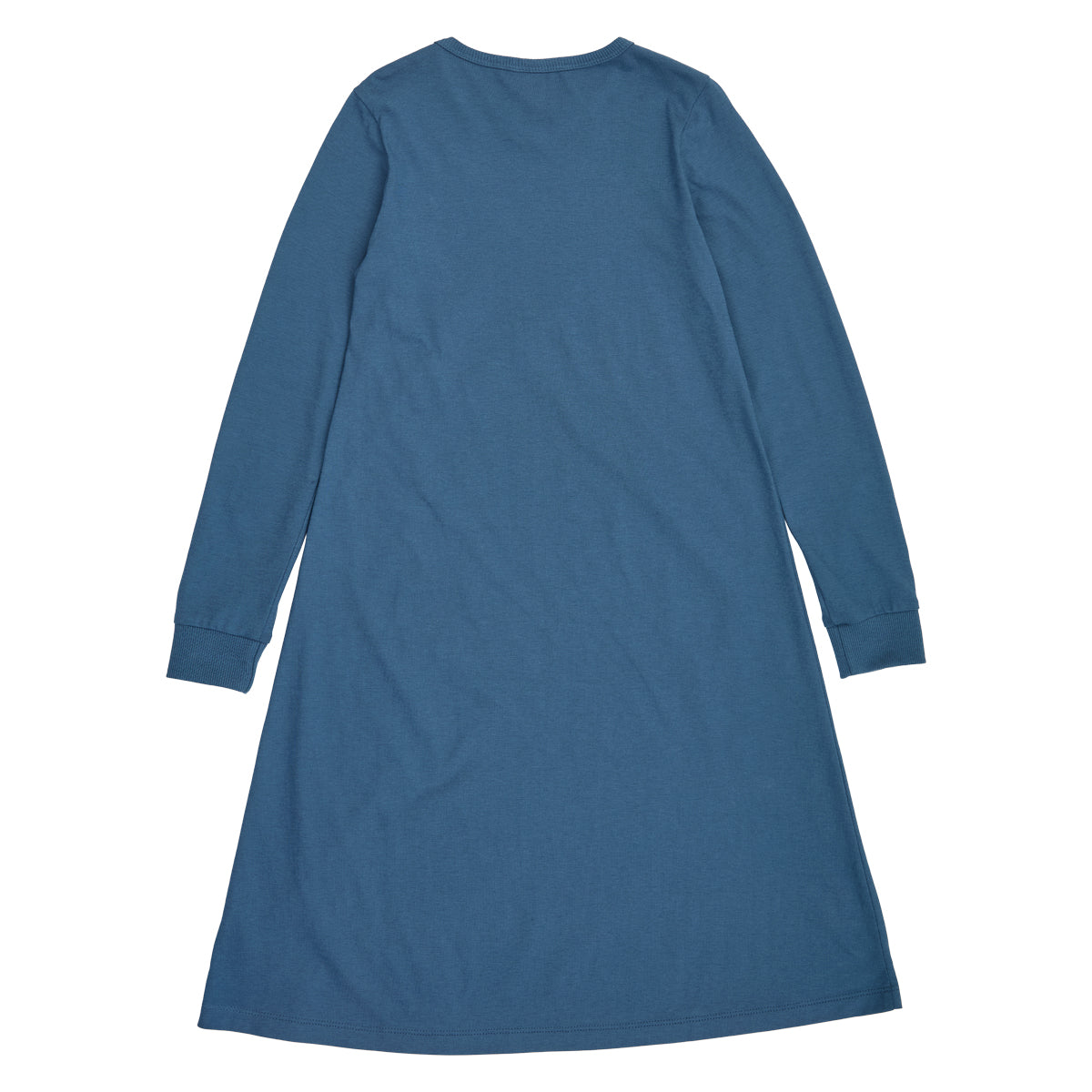 The dress has long sleeves and is knee-length.
