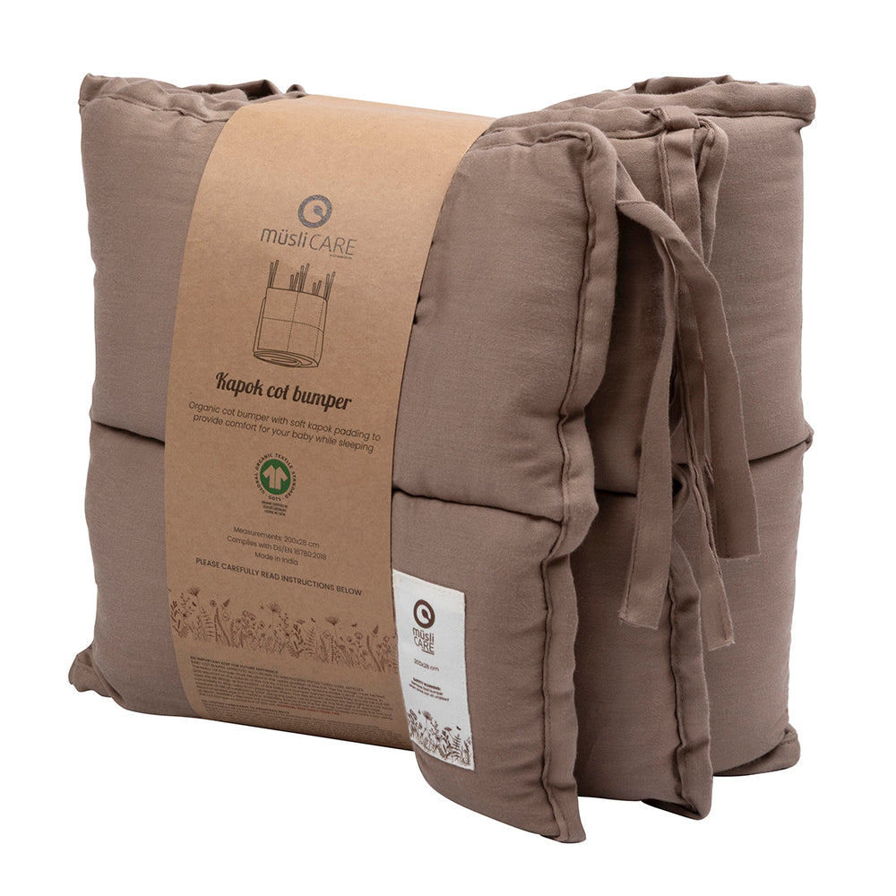 Solid-colored kapok cot bumper with ties. A kapok cot bumper can create safety for a small child in a large bed.
