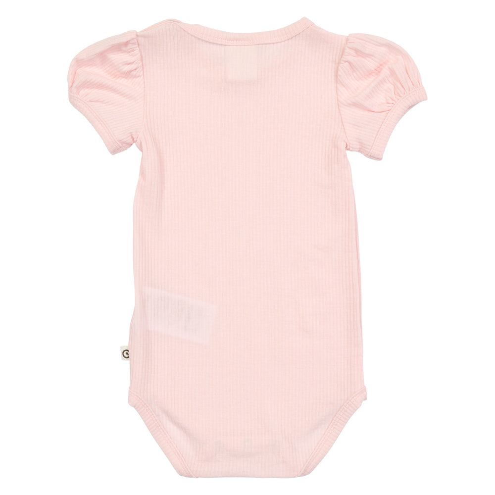 The body has cute short puff sleeves and opens at the neckline and at the bottom with snap buttons