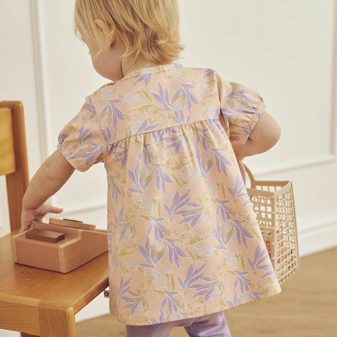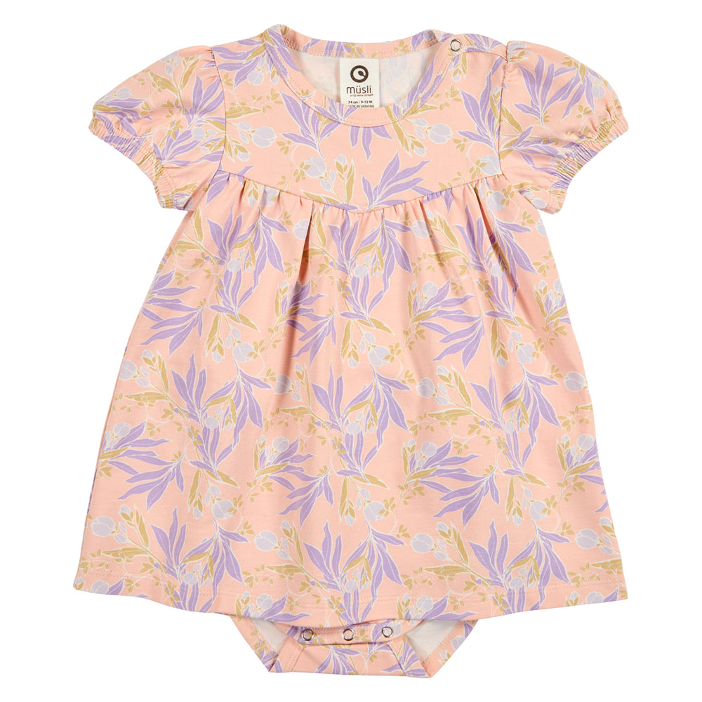 Sweet and feminine dress body with short puff sleeves and a beautiful, colorful all-over print of flowers