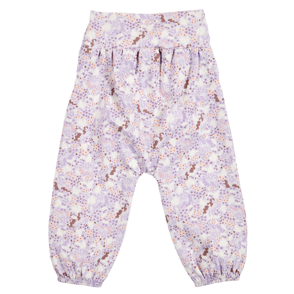 Lovely and feminine pants with a sweet all-over print of flowers and horses from the prairie.